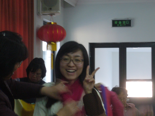 上图为调研室的女生相互交流围巾佩戴的心得与体会